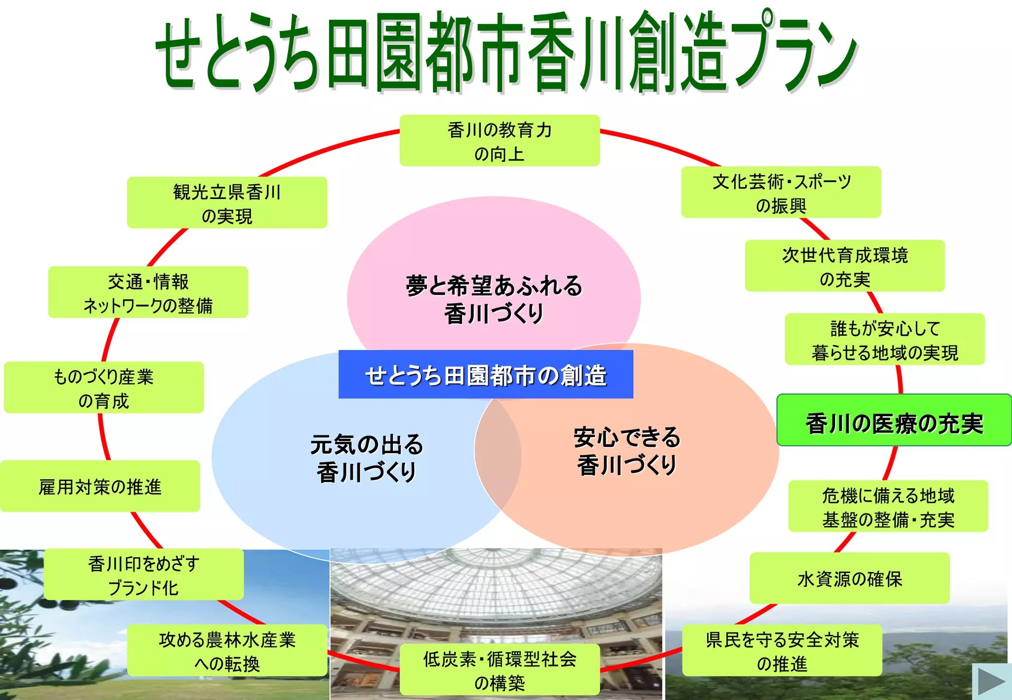 香川の教育力 の向上 文化芸術・スポーツ の振興 観光立県香川 の実現 交通・情報 ネットワークの整備 夢と希望あふれる 香川づくり 次世代育成環境 の充実 誰もが安心して 暮らせる地域の実現 せとうち田園都市の創造 ものづくり産業 の育成 雇用対策の推進 元気の出る 香川づくり 安心できる 香川づくり 危機に備える地域 基盤の整備・充実 香川印をめざす ブランド化 攻める農林水産業 への転換 香川の医療の充実 水資源の確保 低炭素・循環型社会 の構築 県民を守る安全対策 の推進