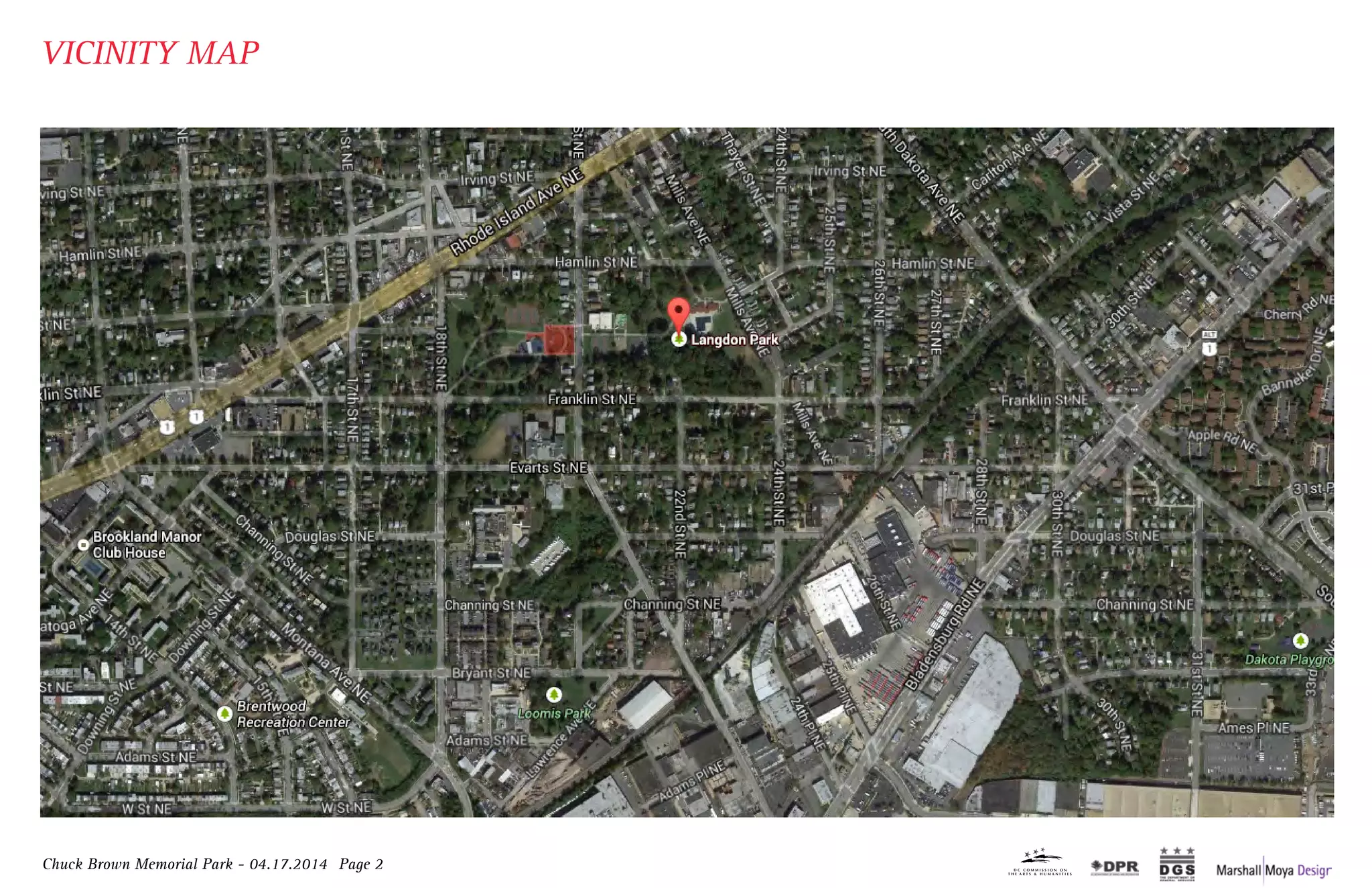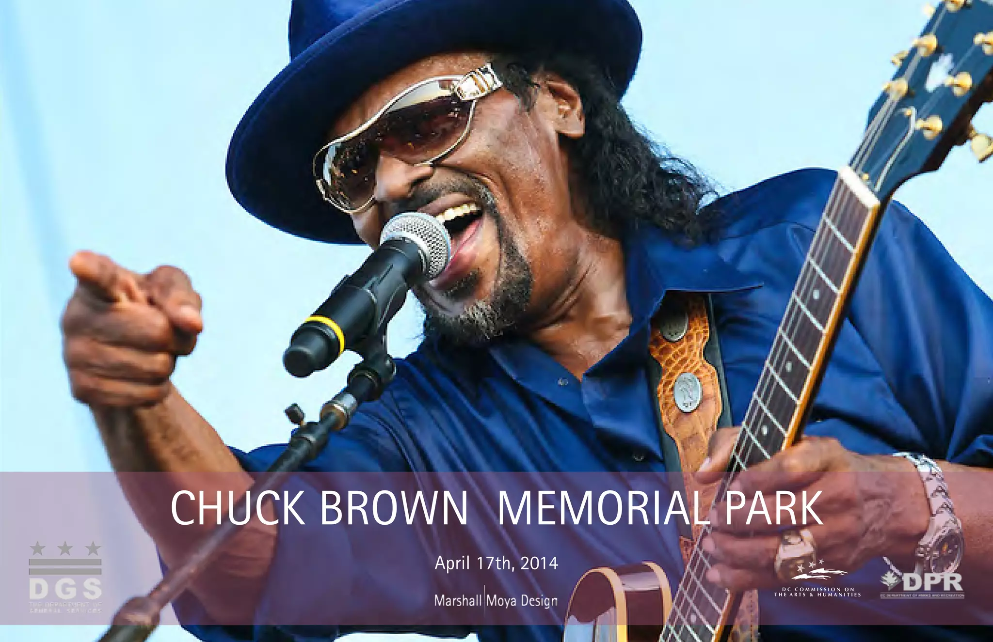 The document presents design plans for Chuck Brown Memorial Park. It includes a vicinity map showing the park boundaries between 18th St NE, 20th St NE, Franklin St NE and Hamlin St NE. The general plan includes features like a memorial wall with images, timeline and discography of Chuck Brown's life and career engraved on aluminum panels and tiles, cherry trees, rain gardens, and public art. Detailed sections are provided for the memorial wall layout with embedded lights, engraved metal panels and tiles listing facts and quotes about Chuck Brown.