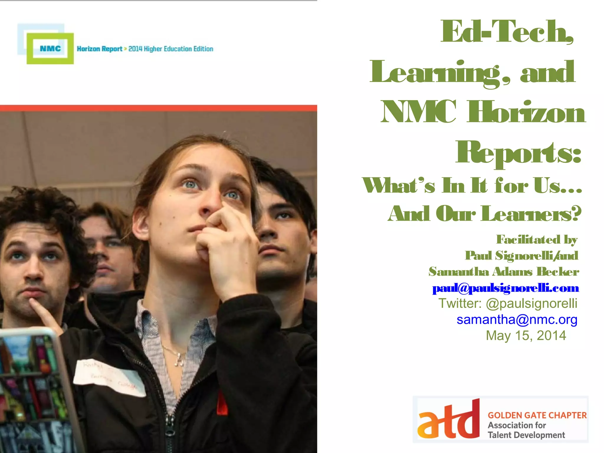 The document discusses key trends and challenges in educational technology, highlighting the rise of social media and the shift from students as consumers to creators. It identifies emerging technologies to watch over the next few years, including flipped classrooms and learning analytics. The report encourages discussions on the impact of these trends and technologies in educational settings.