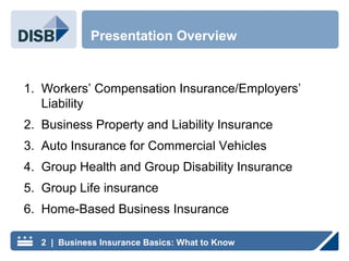 The document outlines essential types of business insurance including workers' compensation, property, liability, interruption, and health insurance necessary for businesses to protect against various risks. It emphasizes the importance of having adequate coverage tailored to specific business operations, particularly for small and home-based businesses. Additionally, it highlights regulations and potential tax credits relevant to health insurance for small employers under the Affordable Care Act.