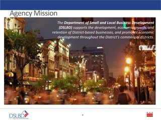 The Department of Small and Local Business Development (DSLBD) supports economic growth and development of small businesses in Washington D.C. through various programs. These include FastTracDC which provides entrepreneur training programs, Get Your Business Online that offers free websites for small businesses, and ConnecTech to help connect small tech firms to funding opportunities. DSLBD also manages the Certified Business Enterprise program that certifies local small businesses to help them compete for D.C. government contracts.