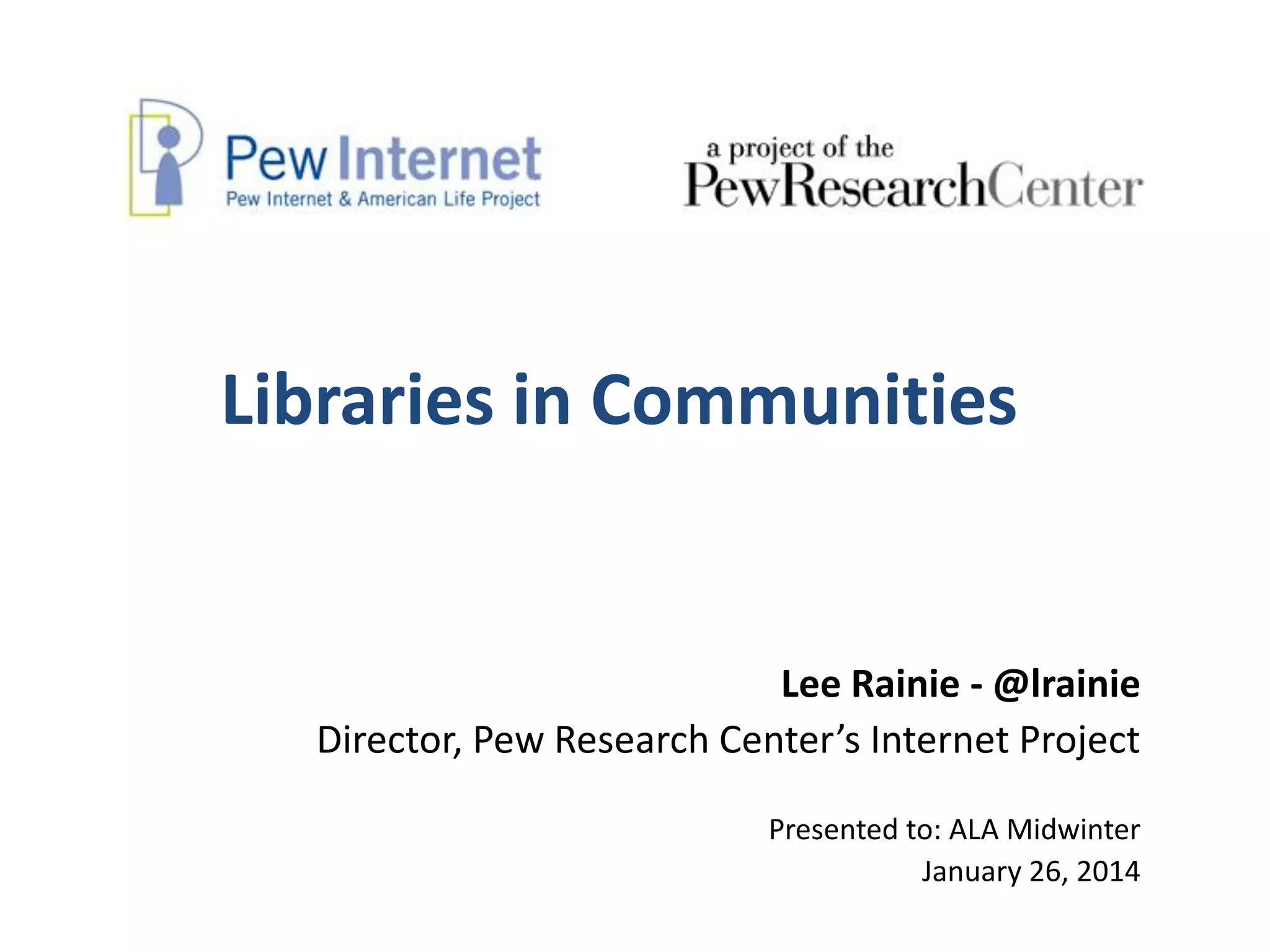 The document presents five key points about the impact and role of libraries in communities, highlighting that libraries are well-regarded for their community contributions, but face shifts in user demographics and expectations. It discusses the changing landscape of library usage, emphasizing the need for libraries to adapt to new technologies and community needs while still providing essential services. Additionally, it outlines various user engagement tiers, from highly engaged 'library lovers' to those less connected, revealing differing levels of reliance on libraries across demographics.