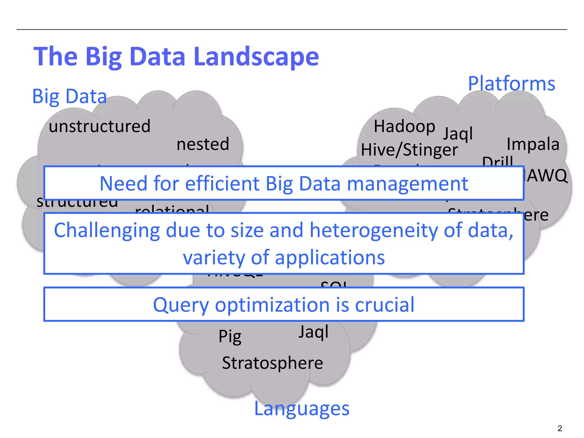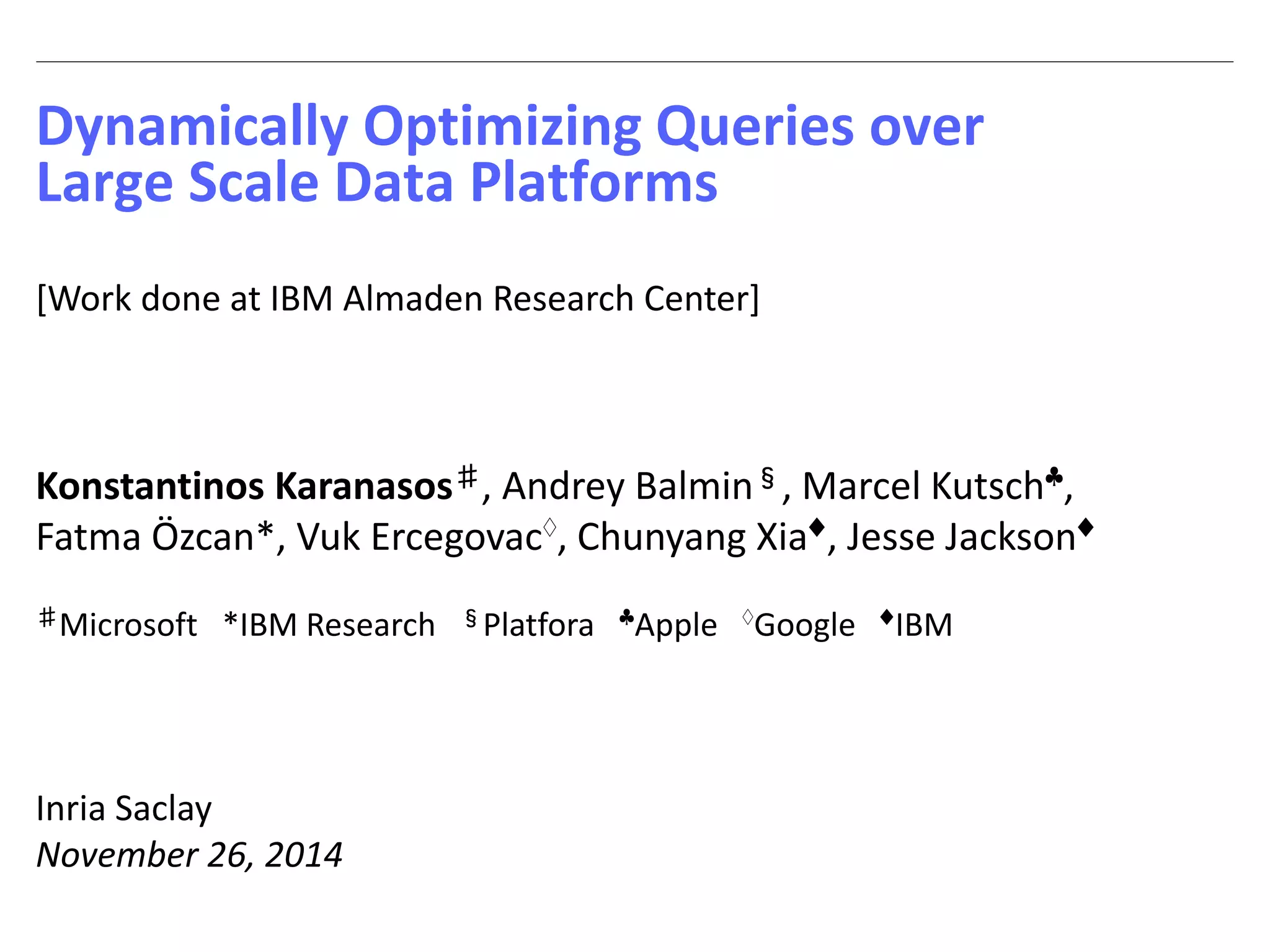 The document discusses dynamic optimization techniques for query processing over large-scale data platforms, primarily focusing on challenges such as exponential error propagation and the need for efficient management of big data. It outlines the use of pilot runs for accurate statistics collection and the adaptation of execution plans to improve performance, demonstrating significant speedup in query execution times. The proposed methods aim to enhance existing static optimization techniques, achieving performance gains of up to 4x, particularly in systems like Hive.