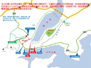 文档描述了前往桃园石门水库赏枫的旅行计划,包括路线、交通和景点。途中经过了多个景点,欣赏美丽的自然风光,并体验了当地特色美食。旅途中的感慨和对往日的回忆增添了旅程的情感色彩。