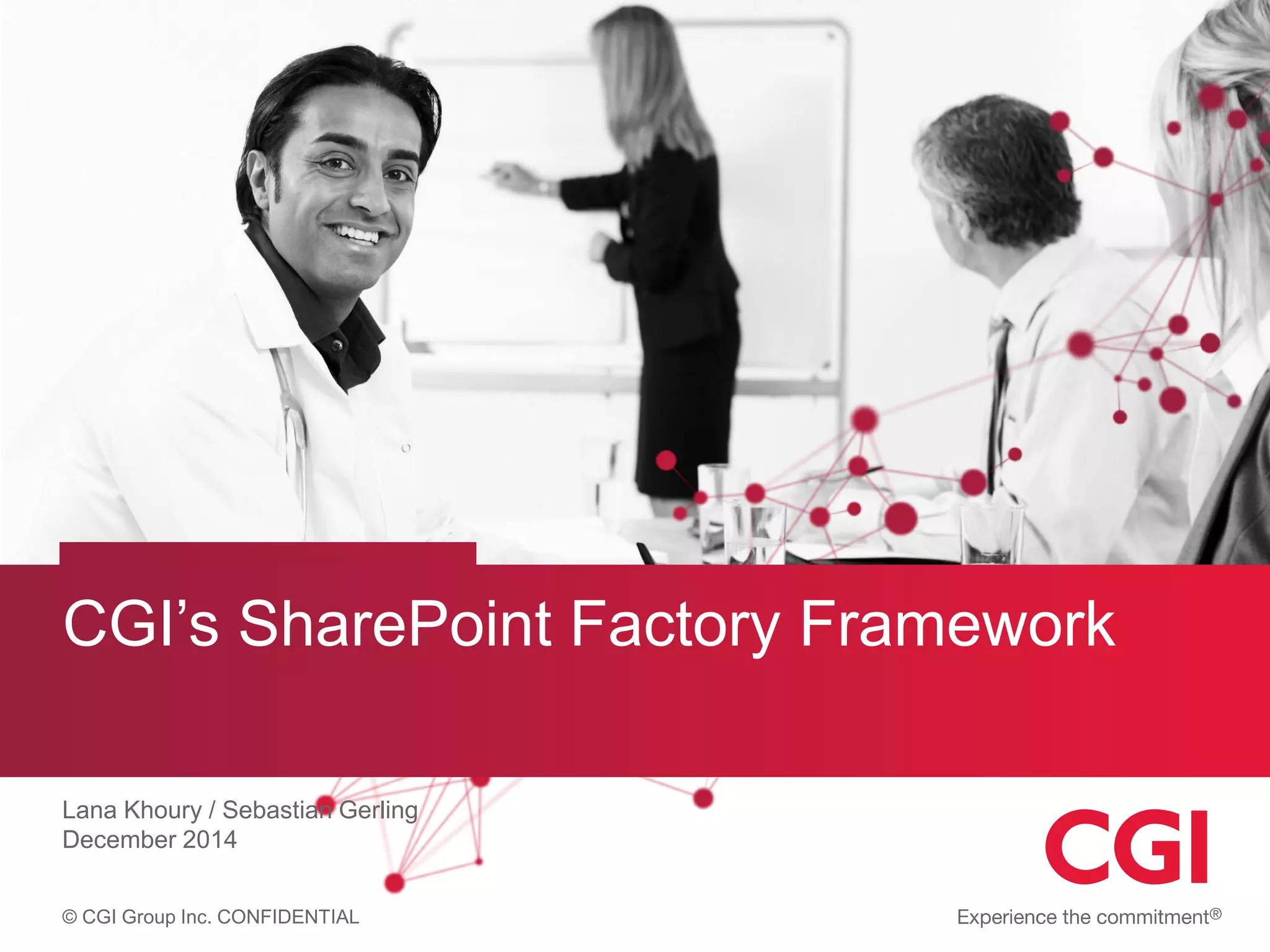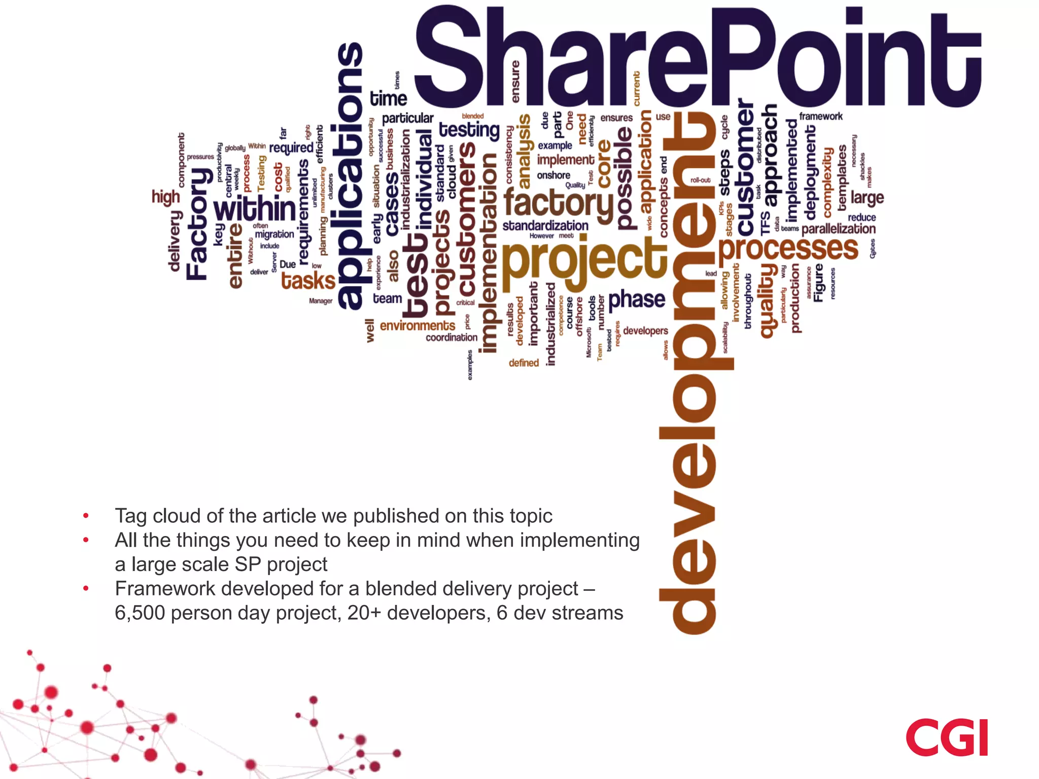 This document discusses CGI's SharePoint Factory Framework for implementing large-scale SharePoint projects. It describes the framework which was developed for a 6,500 person day project involving 20+ developers across 6 development streams. The framework aims to standardize processes, tools, and best practices to improve quality, cost control, and service management while providing a flexible and scalable approach. It utilizes a blended delivery model and establishes key performance indicators to evaluate output quality.