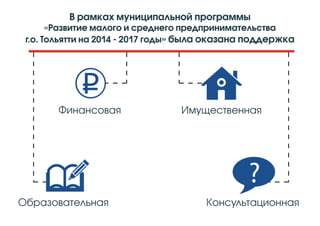 Документ описывает деятельность агентства экономического развития Тольятти и его бизнес-инкубатора, включая информацию о площади, созданных рабочих местах и резидентах. В нем представлены данные о проведении различных семинаров и консультаций для поддержки предпринимателей, а также о сотрудничестве с международными партнерами. Также упоминается значимость сертификации и соблюдения законодательных требований для повышения конкурентоспособности российских предприятий.