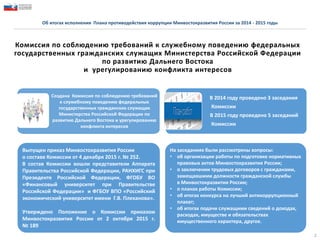 Документ подводит итоги выполнения плана противодействия коррупции Минвостокразвития России за 2014-2015 годы, в ходе которого проведено множество заседаний комиссии и разработаны нормативные правовые акты. Упоминаются мероприятия по оценке коррупционных рисков, правовому просвещению гражданских служащих и обеспечению открытости при осуществлении закупок. Приняты меры для повышения эффективности антикоррупционной работы и информирования граждан о деятельности министерства.
