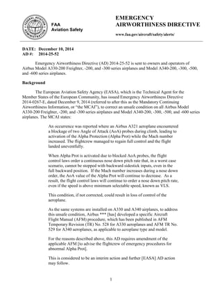 The FAA issued Emergency Airworthiness Directive 2014-25-52 for Airbus A330 and A340 aircraft to address an unsafe condition related to the blockage of angle of attack (AOA) probes, which can lead to loss of aircraft control. This directive mandates revisions to the aircraft flight manuals to include emergency procedures for abnormal activation of the alpha protection system. Compliance with these procedures is required within two days of receipt of the directive.