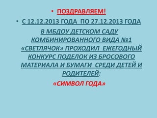 В детском саду №1 «Светлячок» прошёл конкурс поделок «Символ года», которому предшествовали занятия с родителями и детьми. В конкурсе активно участвовали разные группы воспитанников, за что администрация выражает благодарность родителям и педагогам. Среди работ были представлены различные новогодние темы, включая ёлочки и стенгазеты.