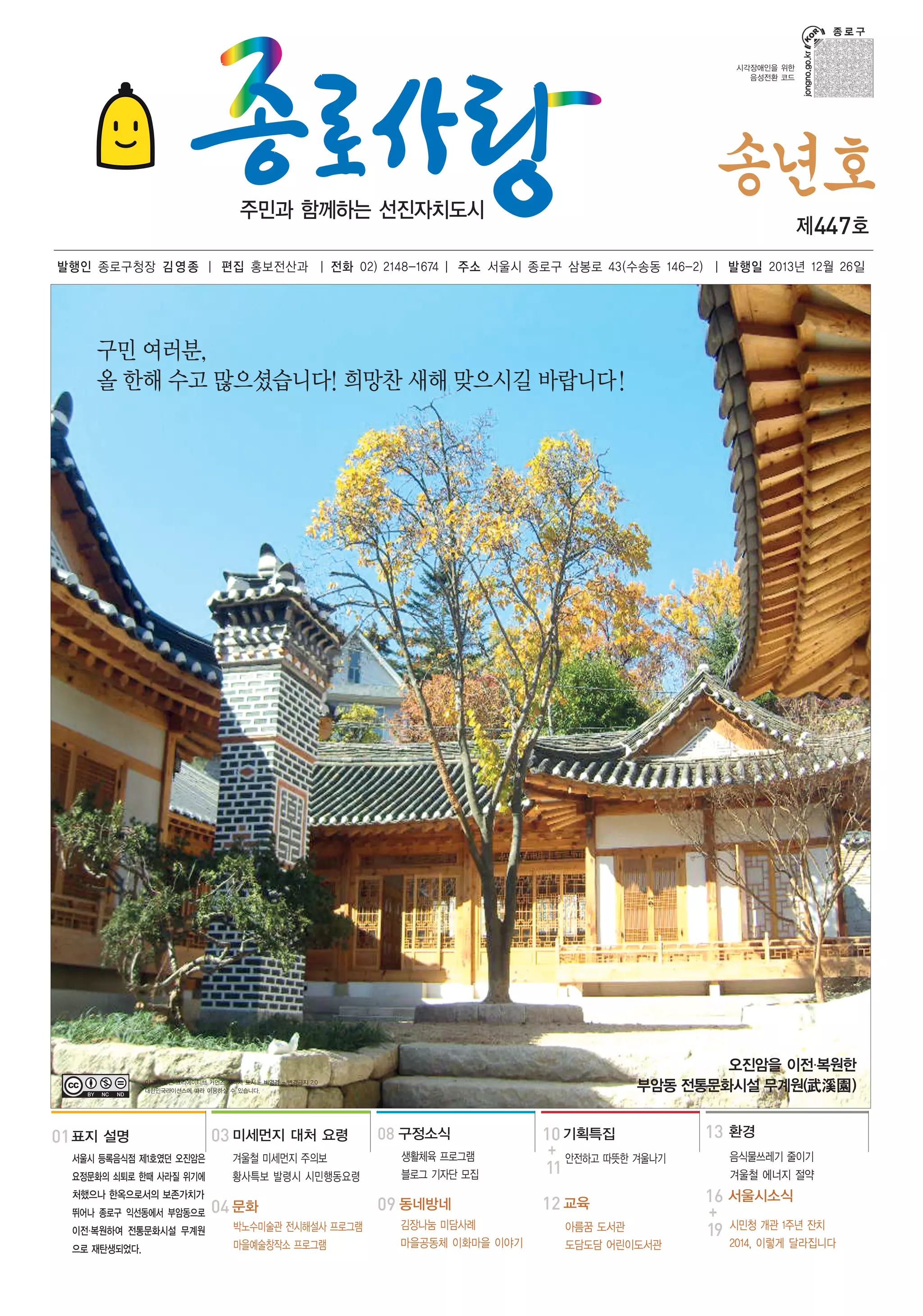 발행인 종로구청장 김영종 | 편집 홍보전산과 | 전화 02) 2148-1674 | 주소 서울시 종로구 삼봉로 43(수송동 146-2) | 발행일 2013년 12월 26일