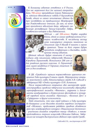В выпуске школьного вестника обсуждается объявленный год культуры в России, запланированные культурные мероприятия, юбилеи и подготовка к международным событиям. Кроме того, рассматриваются инициативы по разработке герба города Гуково и вопросы обязательной школьной формы. В документе также поднимается проблема снижения интереса к чтению среди молодежи и пути возрождения этой традиции.