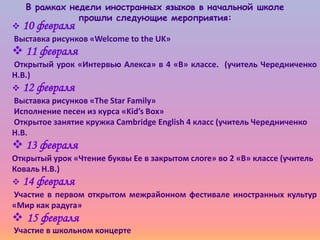 В рамках недели иностранных языков в начальной школе прошли разнообразные мероприятия, включая выставки рисунков, открытые уроки и участие в межрайонном фестивале. Ученики продемонстрировали свои навыки в английском языке и получили сертификаты за успешную сдачу международного экзамена. Церемония вручения сертификатов прошла в рамках школьного концерта.