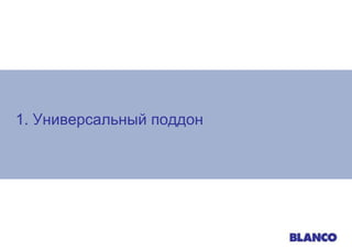 Документ описывает аксессуары для моек Blanco, включая универсальный поддон и многослойную разделочную доску. Универсальный поддон подходит для всех типов монтажа и изготовлен из качественного пластика, а разделочная доска универсальна для разных моделей моек и выполнена из сочетания пластика и древесины ясеня. Оба продукта демонстрируют современный дизайн и высокую функциональность.