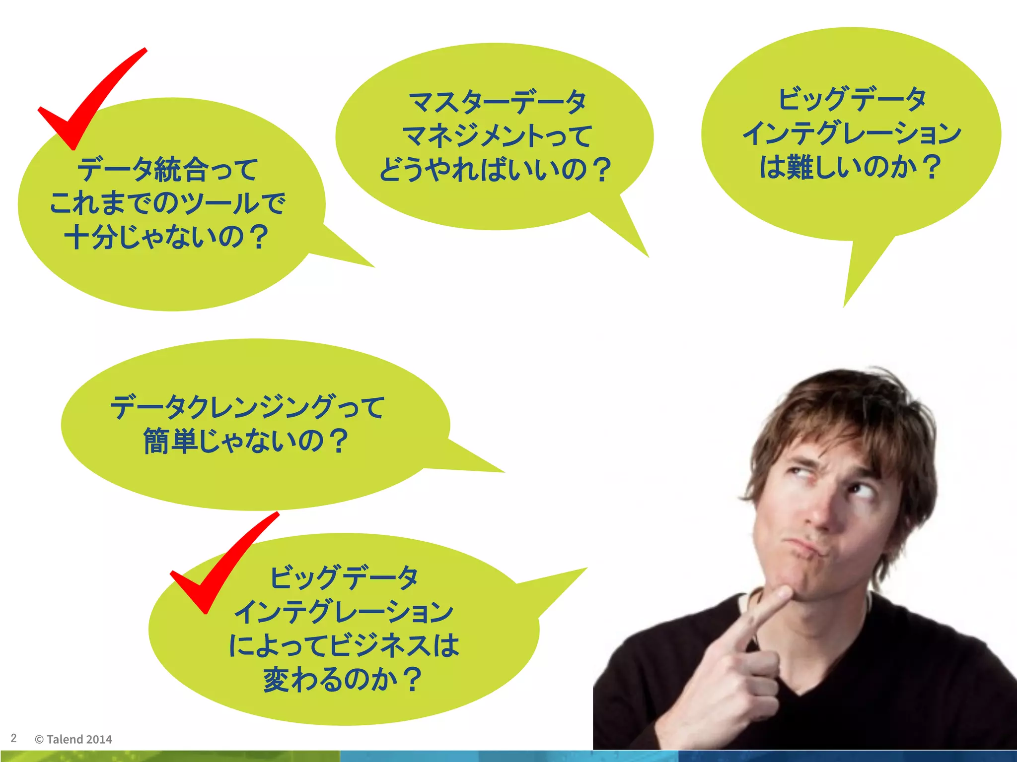2014 ビッグデータ インテグレーション によってビジネスは 変わるのか? ビッグデータ インテグレーション は難しいのか? マスターデータ マネジメントって どうやればいいの? データクレンジングって 簡単じゃないの? データ統合って これまでのツールで 十分じゃないの?