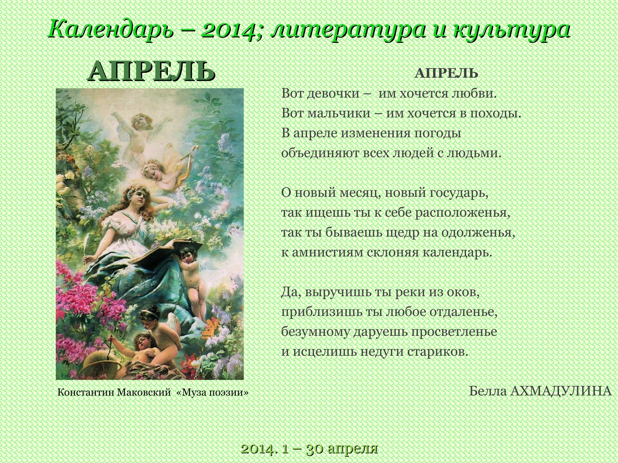 Документ представляет собой литературный и культурный календарь на апрель 2014 года, включающий важные даты, юбилеи и праздники. Отмечаются значимые события и персоналии, такие как день рождения Николая Гоголя, Международный день детской книги и День космонавтики. Также указаны достижения и вклад различных деятелей культуры и искусства.