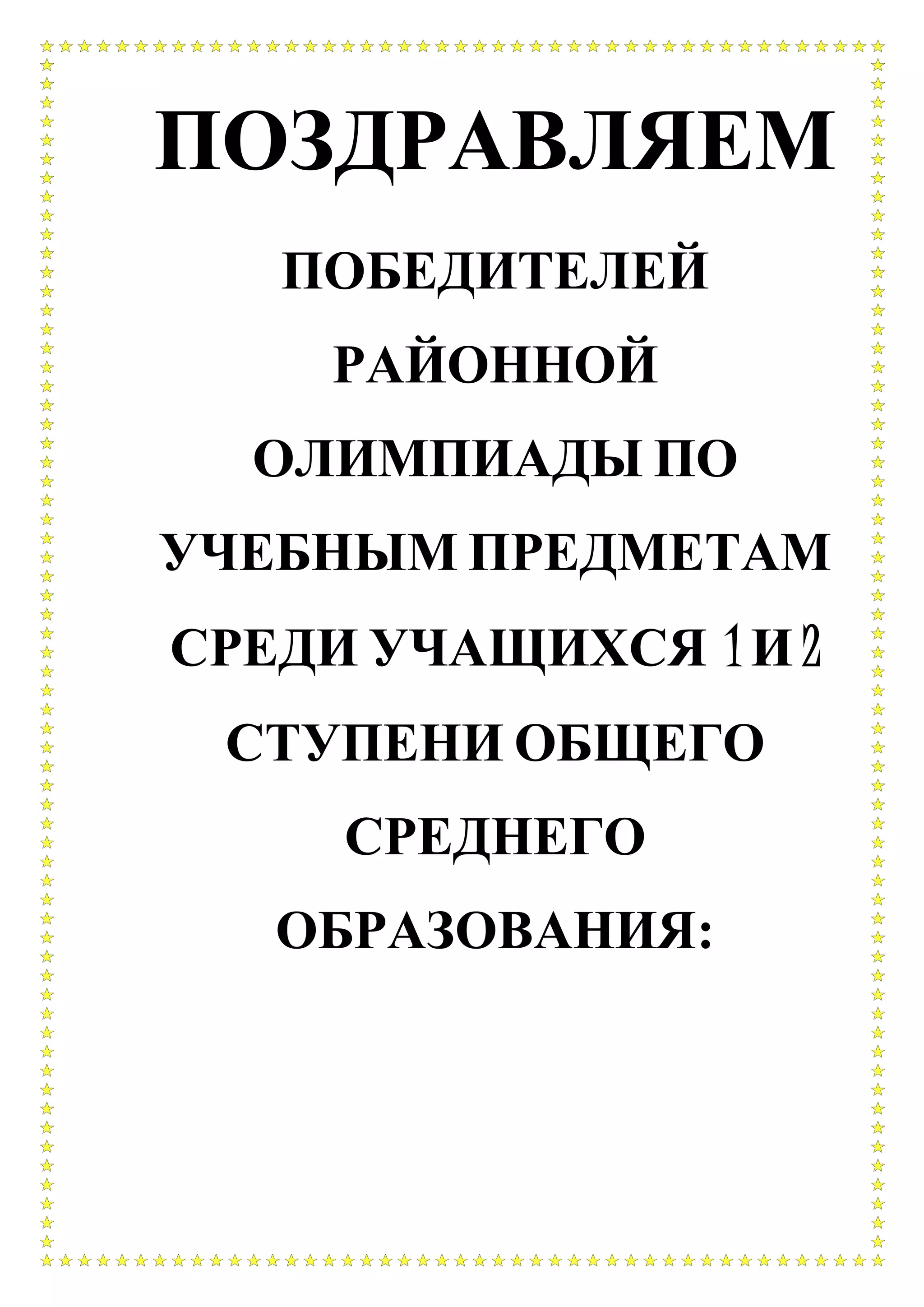 Документ поздравляет победителей районной олимпиады по учебным предметам среди учащихся 1 и 2 ступени общего среднего образования, перечисляя их имена, занятые места и именя педагогов, которые их подготовили. Упоминаются победители по белорусскому, русскому и английскому языкам, биологии, математике, истории и трудовому обучению. Документ выражает гордость за достижения учащихся и их преподавателей.