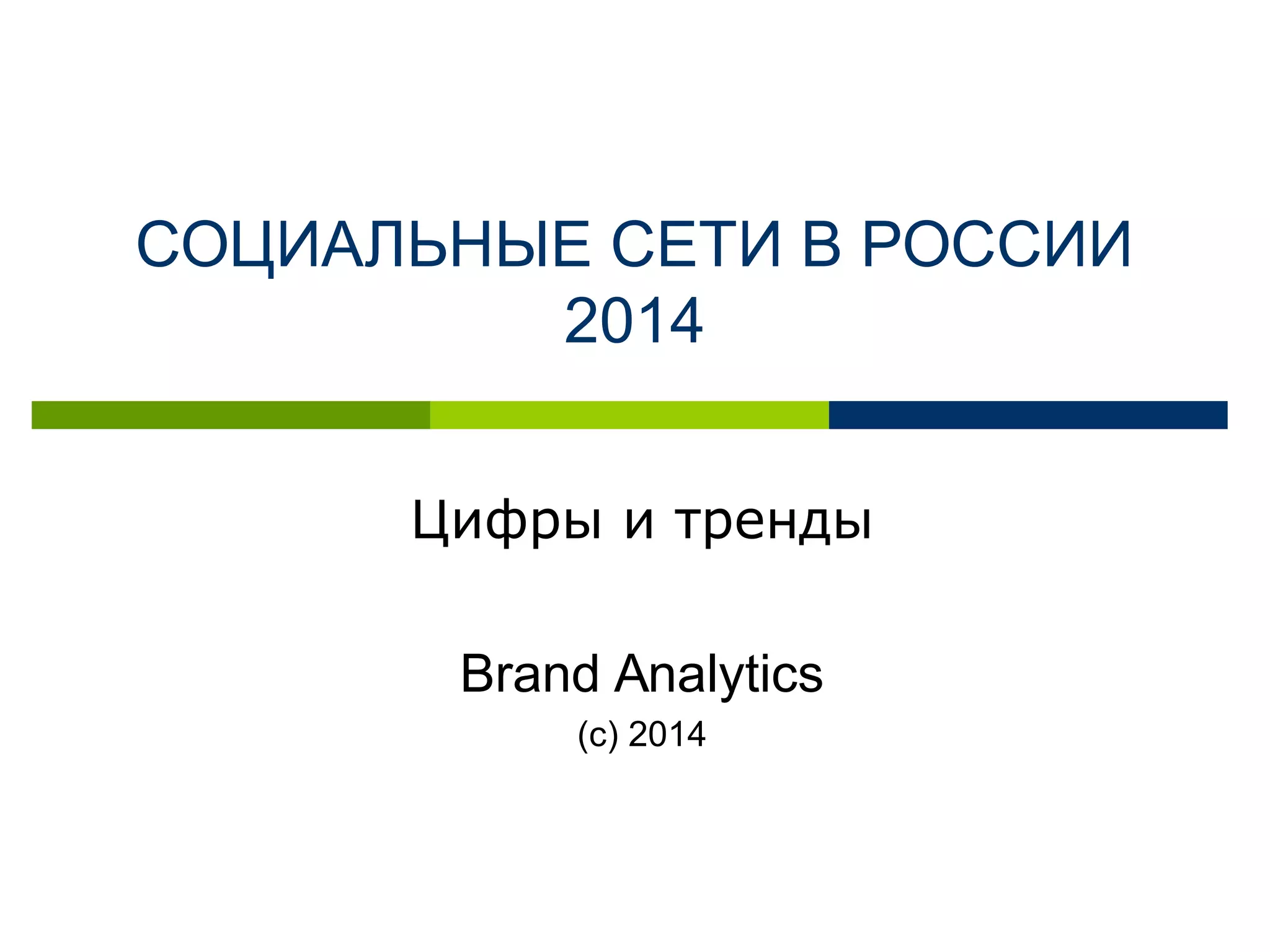 Документ анализирует использование социальных сетей в России в 2014 году, подчеркивая важность активных пользователей, которые выражают свое мнение через открытый контент. Около 82% пользователей интернета имеют аккаунты в социальных сетях, а общая аудитория социальных медиа значительно превышает аудиторию соцсетей. В документе также представлена статистика по популярным платформам и количеству генерируемого контента.