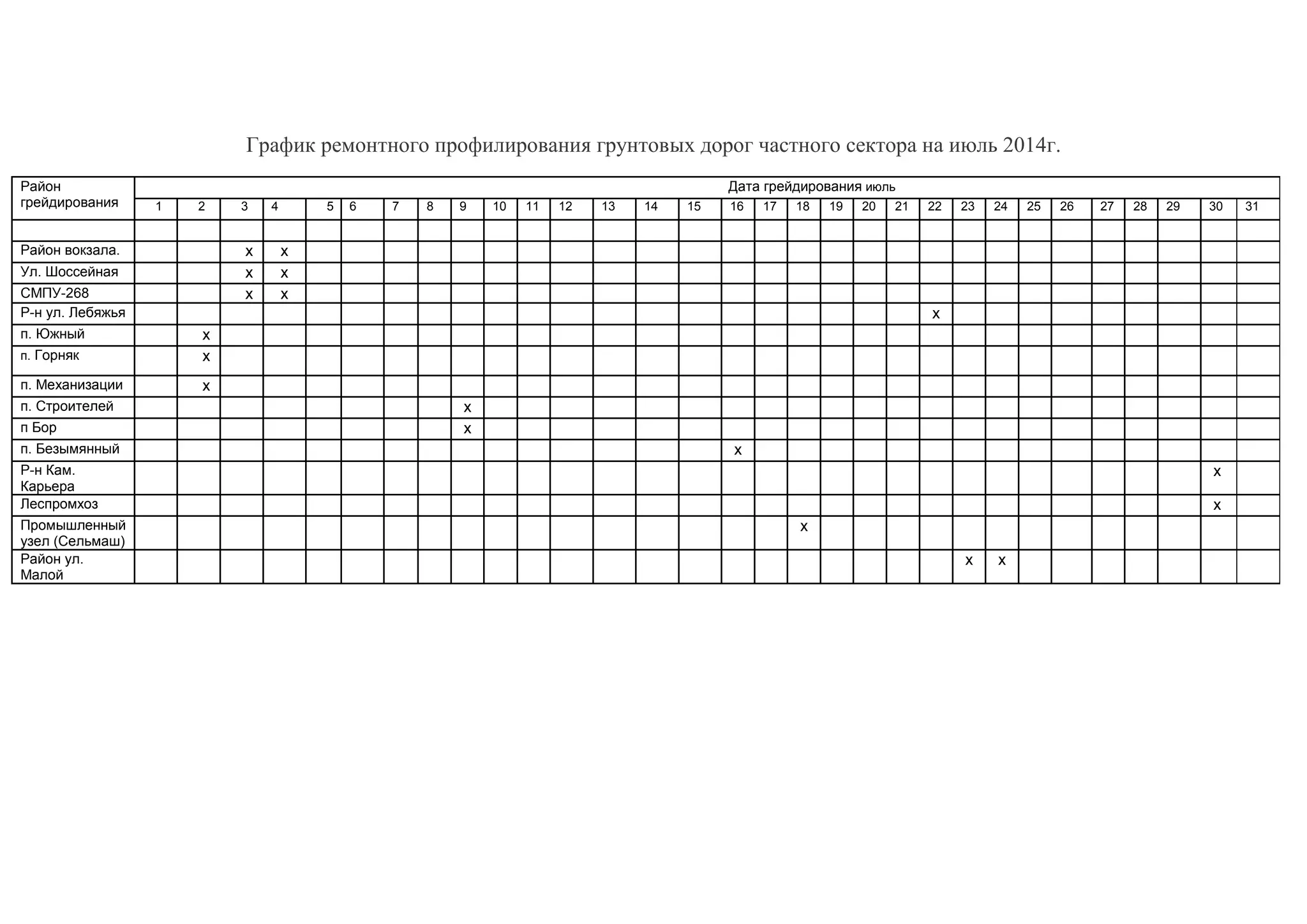 Документ представляет собой график ремонтного профилирования грунтовых дорог частного сектора на июль 2014 года, с указанием районов greidирования и дат. В списке упоминаются различные улицы и местности, где будет проводиться работа. Основные районы включают вокзал, ул. шоссейную, ул. лебяжью и р-н каменного карьера.