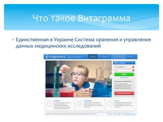 Vitagramma.com - уникальная в Украине система хранения и управления данными медицинских исследований, которая обслуживает более 1 миллиона пользователей. Платформа предлагает личные кабинеты для пациентов, где они могут управлять результатами анализов и получать персонализированные рекомендации. С помощью партнерства с лабораторией 'Синэво' осуществляется интеграция результатов анализов, что улучшает качество обслуживания и взаимодействие между пациентами и врачами.