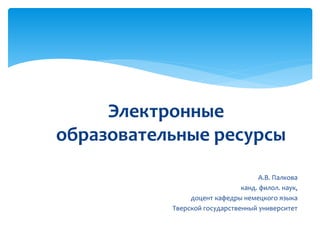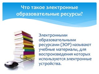 Документ рассматривает электронные образовательные ресурсы (ЭОР), определяя их как учебные материалы, использующие электронные устройства. Описаны виды ЭОР, их инновационные качества, такие как адаптивность, интерактивность и мультимедийность, а также возможности адаптации к индивидуальным потребностям учащихся. Также представлены типология ЭОР и компьютерных заданий, ориентированных на обучение языку, с акцентом на развитие всех видов речевой деятельности.