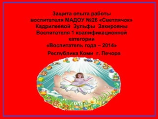 Документ представляет собой защиту опыта работы воспитателя Зульфы Закировны Кадрилевой в МДОУ №26 «Светлячок», где она трудится с 1993 года, акцентируя внимание на методах и технологиях, способствующих физическому, социальному и экологическому воспитанию детей. Воспитатель использует разнообразные формы работы, включая проектную деятельность и оздоровительные мероприятия, для формирования у детей здоровья и интереса к окружающему миру. Особое внимание уделяется взаимодействию с родителями и общественными организациями в целях повышения качества дошкольного образования и поддержки патриотического воспитания.