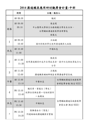 本文件介绍了2014年台湾辅助沟通系统发展学会的沟通辅具应用研讨观摩会的目的及细节。会议旨在分享身心障碍者使用沟通辅具的经验,促进沟通辅具的推广与应用。活动将于12月21日举行,免费向所有对沟通辅具有兴趣的人开放。