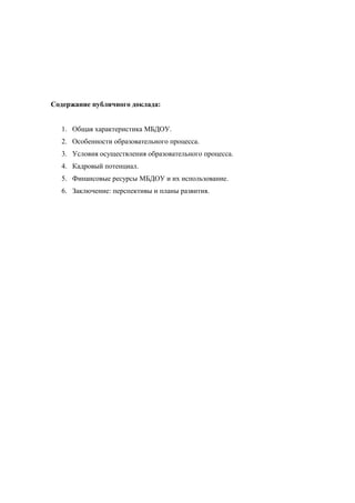 Публичный доклад МБДОУ ЦРР - детского сада первой категории 'Здоровый ребенок' за 2013-2014 учебный год описывает общую характеристику, образовательный процесс, кадровый потенциал и условия для обучения. Учреждение обеспечивает комплексное развитие детей, проводит коррекционно-развивающую работу и сотрудничает с другими образовательными учреждениями. Также акцентируется внимание на материально-технических условиях, безопасности и питании, что подтверждает высокий уровень образовательной деятельности.