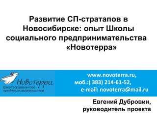 Документ описывает развитие социального предпринимательства в Новосибирске через школу «Новотерра», где было проведено более 20 сессий и реализовано 300 проектов. Основное внимание уделяется культурной индустрии, экобизнесу и образовательным инициативам, направленным на поддержку людей с ограниченными возможностями и молодежи из трудных условий. Также рассматриваются форматы мероприятий, такие как проектные тренажеры и клубы, способствующие разработке и внедрению новых бизнес-идей.