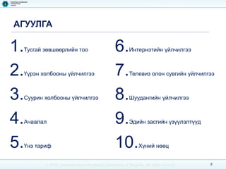 Communications Regulatory Commission of Mongolia. All rights reserved 2.5 Ухаалаг утас хэрэглэгчдийн тоо Бүртгэлтэй хэрэглэгч/2014.06.30/ Android: 582,783 Microsoft windows mobile: 5,647 IOS /Apple/: 137,092 Гар утас хэрэглэгч: 4.337.644 /2014.06.30/ Ухаалаг утас: 1.473.825 /2014.06.30/ Ухаалаг утас:ны өсөлт: /2013.12.31 -нд / 1.135.46429.8 % Нийт бүртгэлтэй хэрэглэгчийн 34% Symbian: 32,619 Research in motion: 11,507 Linux: 122 Maemo: 188 Бусад: 703,867 1.Тусгай зөвшөөрлийн тоо 2.Үүрэн холбооны үйлчилгээ 3.Суурин холбооны үйлчилгээ 4.Ачаалал 5.Үнэ тариф 6.Интернэтийн үйлчилгээ 7.Телевиз олон сувгийн үйлчилгээ 8.Шуудангийн үйлчилгээ 9.Эдийн засгийн үзүүлэлтүүд 10.Хүний нөөц