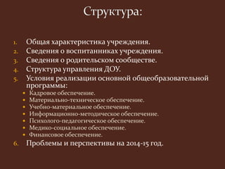 Публичный доклад за 2013-2014 учебный год информирует о деятельности муниципального казенного детского сада, включая характеристику учреждения, воспитанников и родительского сообщества. Доклад затрагивает реализацию образовательной программы, кадровое и материально-техническое обеспечение, а также проблемы и перспективы на следующий год. В результате работы учреждения достигнут высокий уровень интеллектуального развития детей, а также активно вовлекаются родители в образовательный процесс.