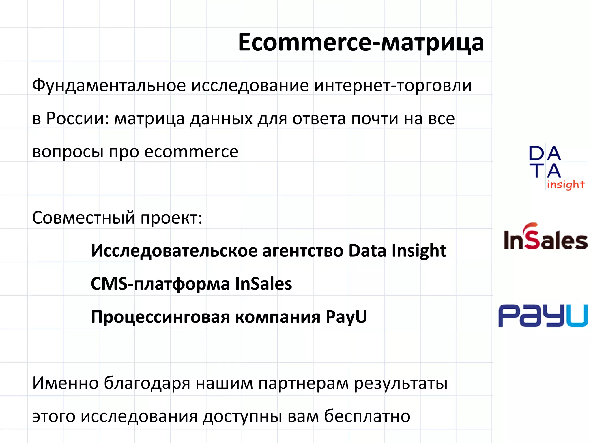 Доклад агентства Data Insight представляет результаты исследования об электронной коммерции в России за 2014 год, включая данные о 25 миллионах активных онлайн-покупателях и их поведении. Основное внимание уделяется критериям выбора интернет-магазинов, частоте покупок и способам оплаты, показывая, что основными факторами являются цена и удобство. Также рассматривается рост объемов рынка и динамика по сравнению с предыдущими годами.