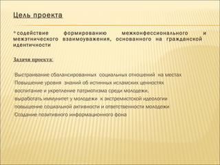 Проект направлен на повышение взаимоуважения между различными религиозными и этническими группами в России, особенно среди молодежи. Основные задачи включают улучшение знаний о исламских ценностях, воспитание патриотизма и создание иммунитета к экстремизму. Реализация проекта запланирована на 2013-2014 годы и включает обучение целевых групп и практическую работу для укрепления межкультурных отношений.