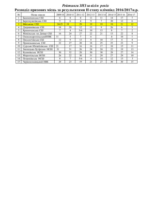 вісім років Розподіл призових місць за результатами ІІ етапу олімпіад 2016/2017н.р. № Назва школи 2009/10 2010/11 2011/12 2012/13 2013/14 2014/15 2015/16 2016/17 1 Башмачанська СШ 6 8 8 11 11 14 17 7 2 Березнуватівська СШ 5 6 4 9 7 20 12 6 3 Військова СШ 24-25 19 29 19 19 19 21 12 4 Дзержинівська СШ 18 20 12 13 9 26 6 5 5 Криничанська СШ 7 4 5-6 10 13 8 7 2 6 Микільська на Дніпрі СШ 16 24 27 22 21 13 22 8 7 ОлександропільськийНВК 11 5 7 6 4 10 1 8 Письмечівська СШ 12 9 13 8 10 17 4 4 9 Привільнянська СШ 22 27 20 18 25 25 23 9 10 Сурсько-Михайлівська СШ 21 17 16 16 17 10 15 11 11 Звонецько-Хутірська НСШ 31 31 26 24 24 22 19 13 12 Калинівська НСШ 30 32 28 30 30 28 27 14 13 Миропільська НСШ 26 22 30 31 29 27 29 10 14 Петриківська НСШ 8 7 5-6 4 14 12 13 3 15 Червономаяцький НВК 20 23 19 21 27 30 30 15