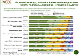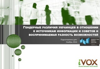Документ содержит результаты исследования гендерных различий в отношении к источникам информации и советов среди украинцев. Мужчины и женщины различаются в своих предпочтениях, доверии к источникам и восприятии возможностей в различных сферах жизни. Вопросы касаются семейного бюджета, воспитания детей, карьеры и здоровья, при этом мужчины чаще обращаются к традиционным СМИ, а женщины предпочитают социальные сети.