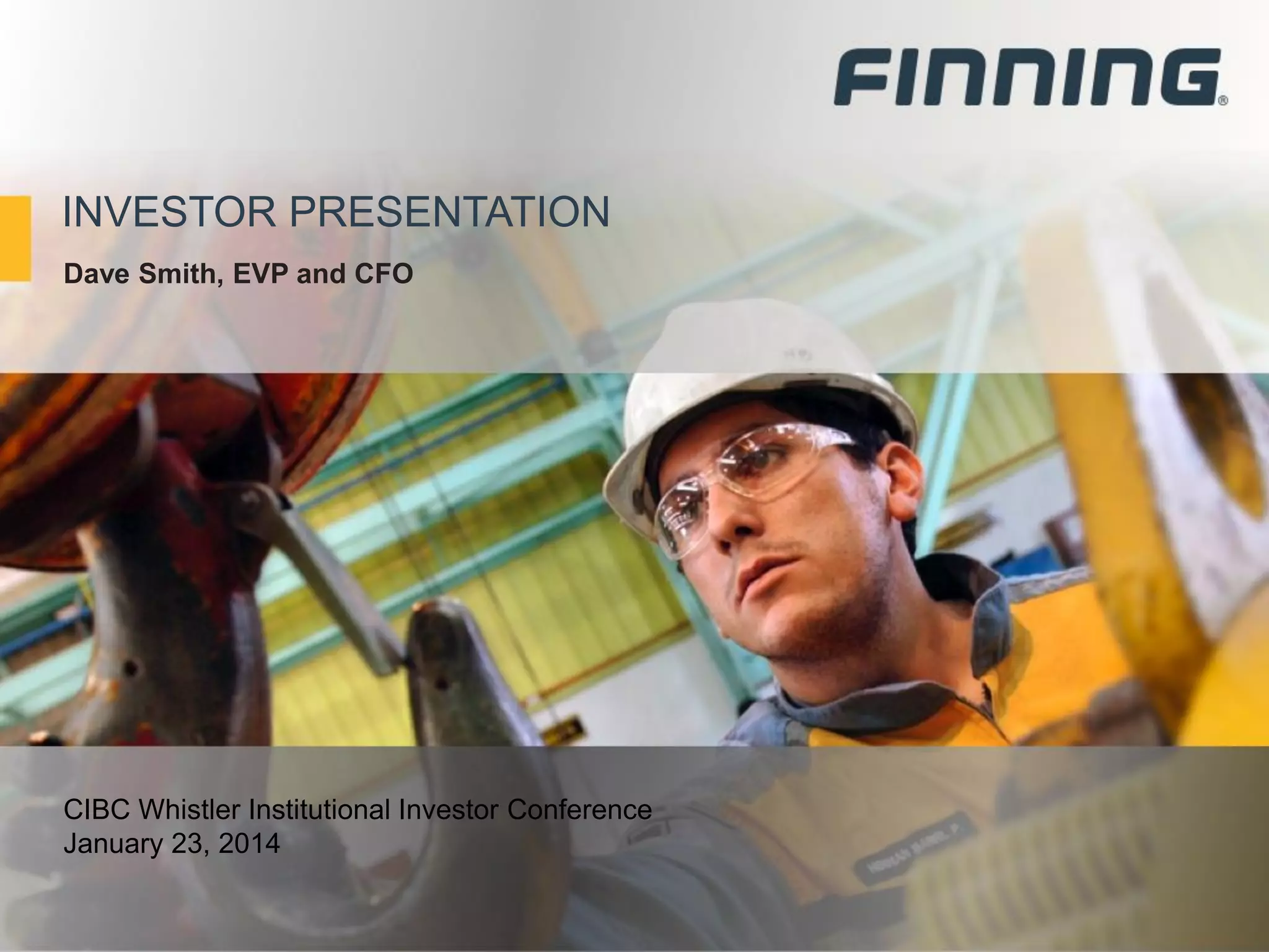 The document is an investor presentation given by the CFO of Finning International Inc. at an institutional investor conference. It outlines Finning's business model and priorities to improve return on invested capital. Key points include: