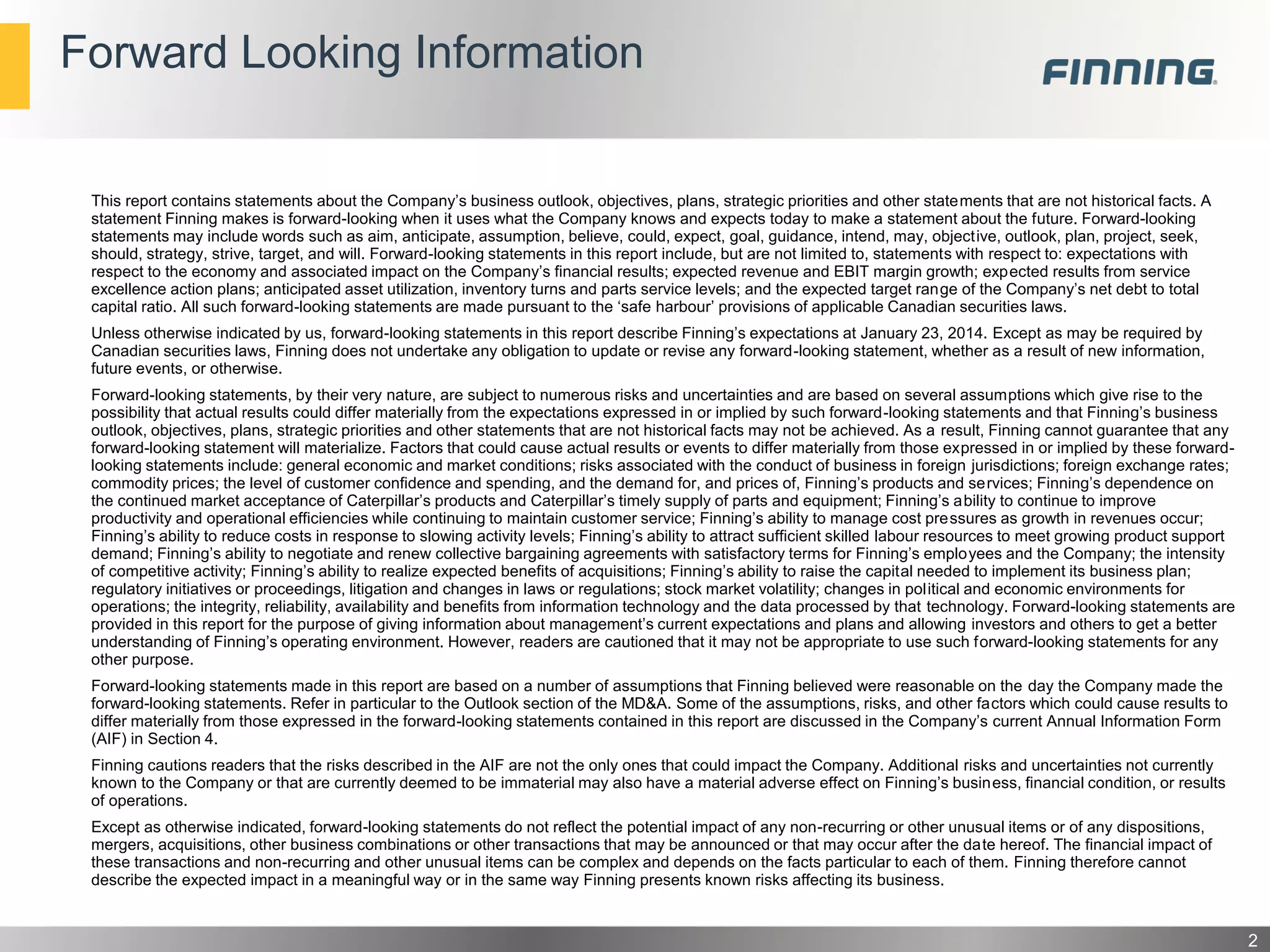 - These initiatives are expected to strengthen Finning's balance sheet by lowering debt levels and generating positive free cash flow through