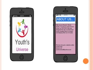 The document describes a proposed mobile app called YouthUniverse that aims to help keep young people occupied and out of trouble by helping them locate their nearest youth clubs. The app would use GPS to find youth centers and activities near the user's location and display information like timetables. This is intended to address the problem of youth hanging out unoccupied on the streets, which some community members complain causes trouble. The app would be free to users with a business model supported by advertisements.