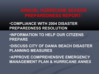 The document is the City of Dania Beach's 2014 Emergency Preparedness Plan. It provides information to help citizens prepare for hurricane season, including evacuation routes and zones, shelter locations, and supply lists. It also outlines preparations the city has taken, such as activating its Emergency Operations Center for training and updating its Comprehensive Emergency Management Plan. The plan emphasizes preparedness through both knowledge and teamwork between citizens and city agencies.