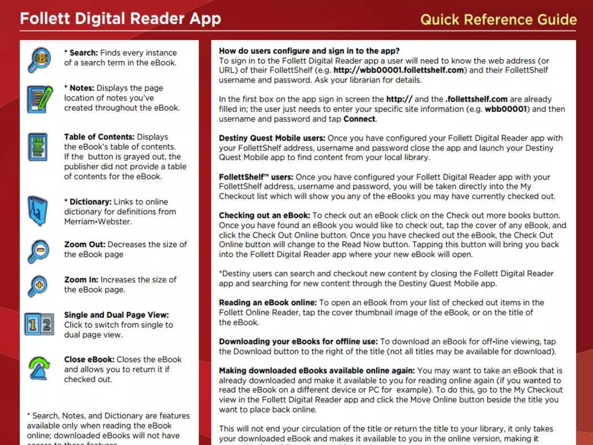 This document provides instructions for students on how to access and use the Destiny Catalog, MyeClass portal, and Follett Shelf e-books. It describes how to log in using a student number and password, activate an account, search for books, place books on hold, check out and view e-books, and pay fines. It also provides some basic features of Destiny like making book lists, searching websites, and accessing audio books and databases.