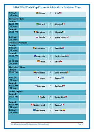 This document provides the fixture and schedule for the 2014 FIFA World Cup in Pakistani time. It lists the dates and times for each group stage match and knockout round match from June 12th to July 13th. The schedule is spread out over 5 pages and includes the dates and start times of 64 total matches between 32 national teams competing across 4 weeks of play.