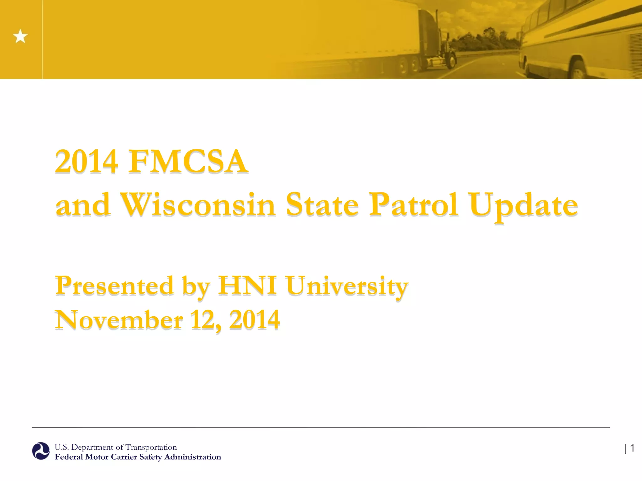 The document summarizes updates from the Federal Motor Carrier Safety Administration (FMCSA) including new hours of service rules, requirements for electronic logging devices, changes to commercial driver's license medical certification procedures, and the establishment of a Drug and Alcohol Clearinghouse. It also discusses the Unified Registration System and updates to the Compliance, Safety, Accountability program for monitoring motor carrier safety performance.