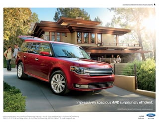 The document provides information on the 2014 Ford Flex, including its features, specifications, and equipment. It highlights the Flex's spacious interior with three rows of seating, efficient powertrain options including a turbocharged EcoBoost engine, driver assistance technologies, and top safety ratings. The Flex is described as impressively spacious, surprisingly efficient, and equally exciting to drive while also being adaptable to various cargo needs.