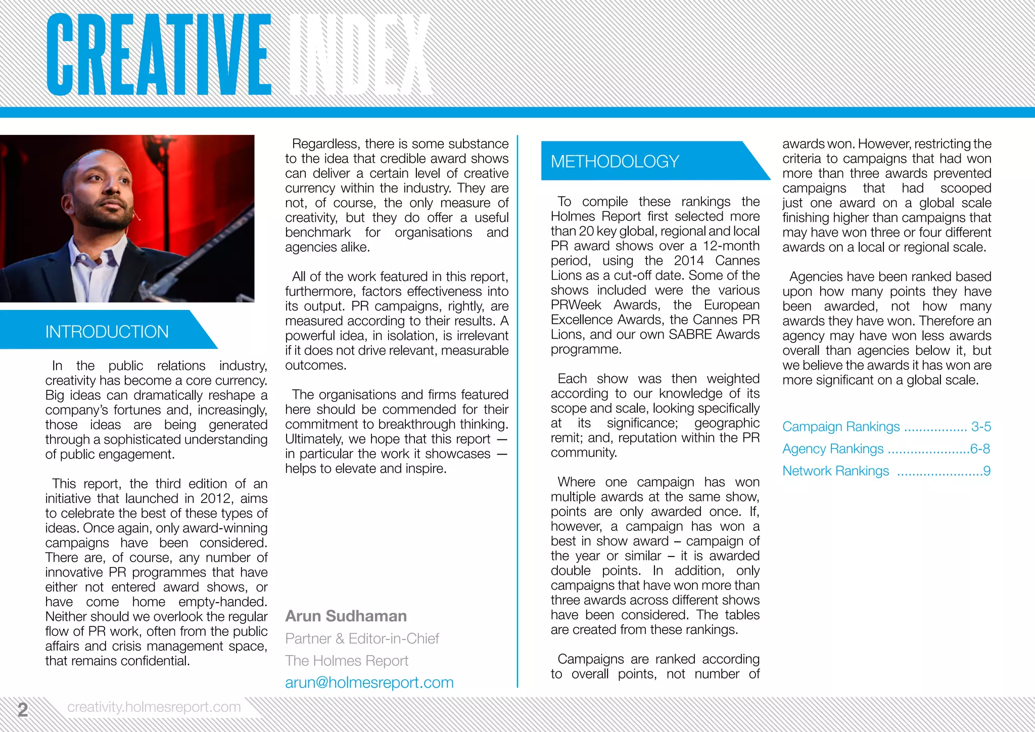 The 2014 Global Creative Index by the Holmes Report ranks top PR campaigns and agencies based on their award-winning effectiveness across various international platforms. The report highlights that creativity is a vital currency in PR, emphasizing measurable outcomes and innovative strategies used in successful campaigns, such as Procter & Gamble's 'Thank You Mom' and the 'Most Powerful Arm Ever Invented.' Rankings reveal a mix of consumer, public sector, and corporate initiatives from diverse geographic regions, showcasing the breadth of creativity in the industry.