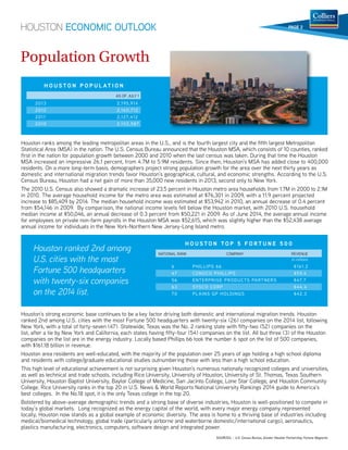 Houston has consistently ranked among the top 10 cities for job and population growth. The document provides statistics showing Houston gained over 82,000 jobs in 2013, has an unemployment rate of 4.6% as of April 2014, and grew its population by over 2% annually from 2012-2014. Houston's economy is led by the energy sector, with over 50% of employment related to oil and natural gas companies, positioning the city as the "Energy Capital of the World".