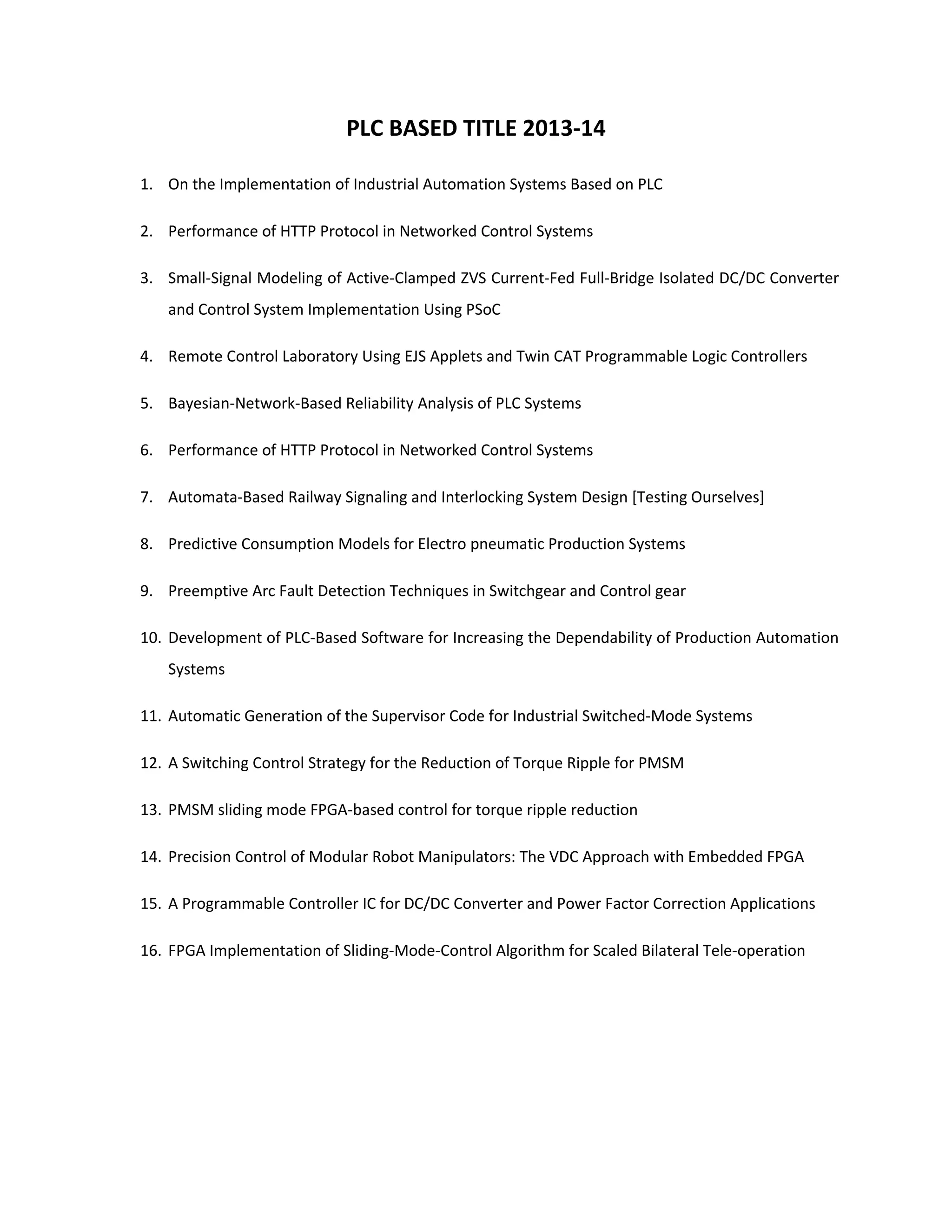 This document lists 15 titles related to programmable logic controllers (PLCs), industrial automation systems, networked control systems, and FPGA implementations. The titles cover topics such as PLC-based implementation of industrial automation, modeling and control of DC/DC converters using PSoC, Bayesian reliability analysis of PLC systems, remote laboratory control using PLCs and EJS applets, predictive consumption models for electro-pneumatic production systems, arc fault detection in switchgear, and precision control of modular robot manipulators using FPGA-based control.