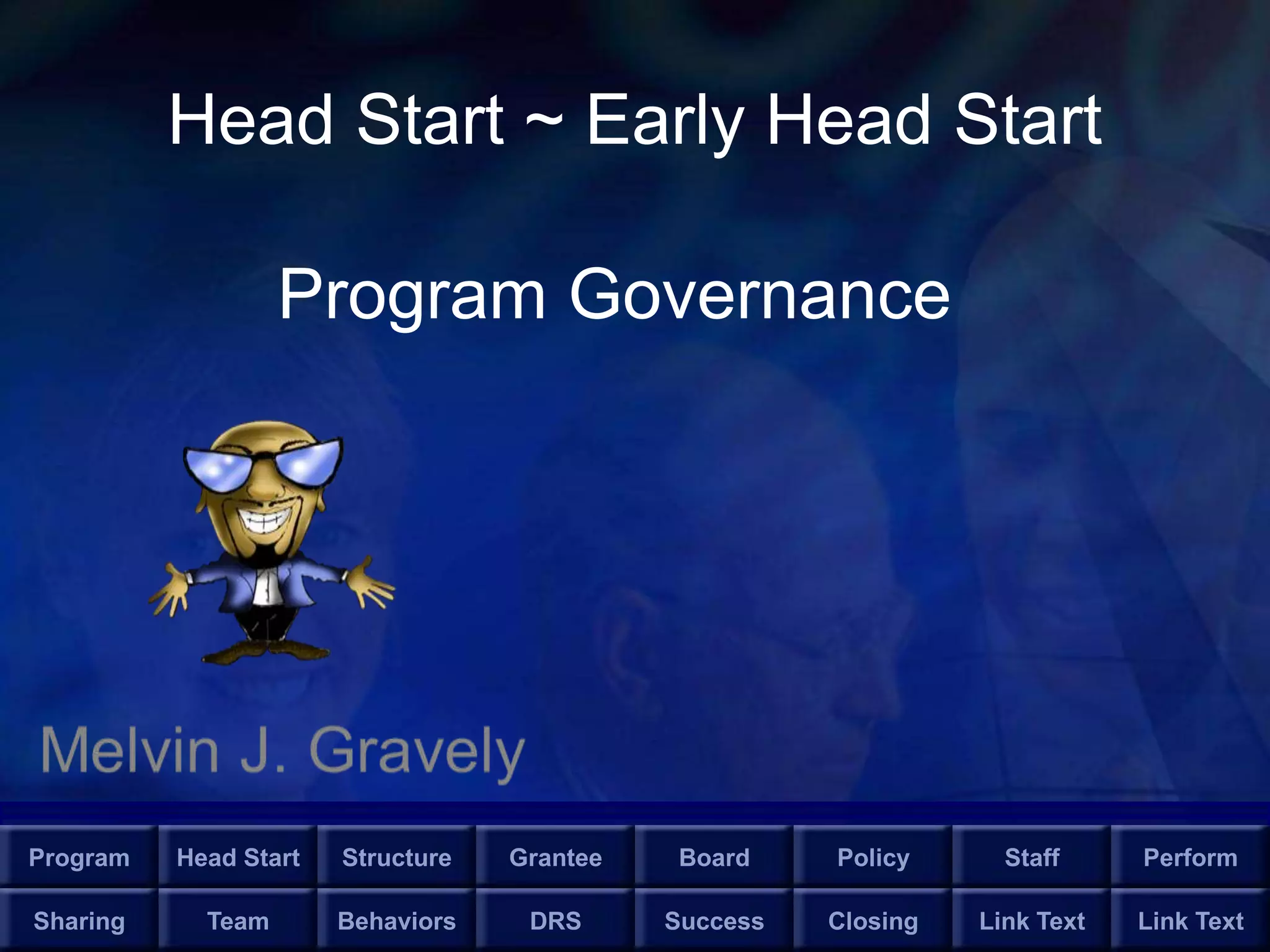 The document discusses the governance structure of Head Start programs. It describes how Head Start programs are governed by a governing board, policy council, and staff. The governing board assumes legal and fiscal responsibility, the policy council assumes responsibility for program direction, and staff assume responsibility for day-to-day operations. It emphasizes the importance of these three groups working collaboratively and sharing information to effectively operate Head Start programs.
