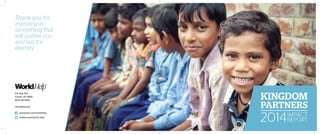 This document provides information about the organization World Help and its work through partnerships. It discusses World Help's mission to provide aid to people in need around the world in over 20 countries. Some key areas of focus discussed include child sponsorship programs, clean water initiatives, malnutrition treatment, Bible distribution, women's health, orphan care, and disaster relief. The organization expresses gratitude to its partners and donors for enabling its humanitarian work and impacting lives for eternity.
