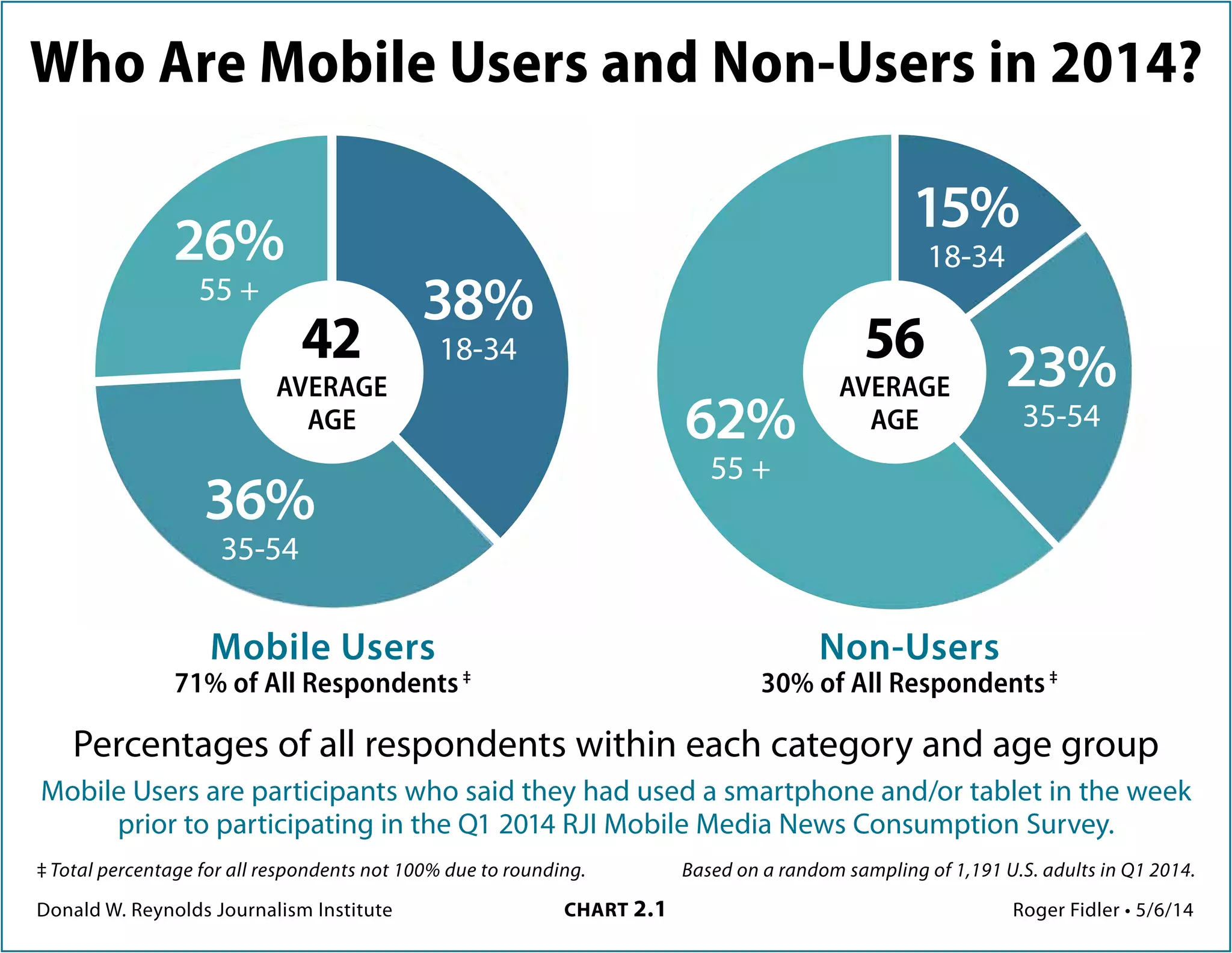 The 2014 RJI Mobile Media News Consumption Survey analyzes mobile media usage among U.S. adults, revealing that 71% are mobile users, with a significant reliance on devices for news consumption. It finds differences in demographics, media preferences, and device ownership between mobile users and non-users across various age groups. The survey highlights trends in news media consumption, illustrating how mobile users engage with different media compared to non-users.