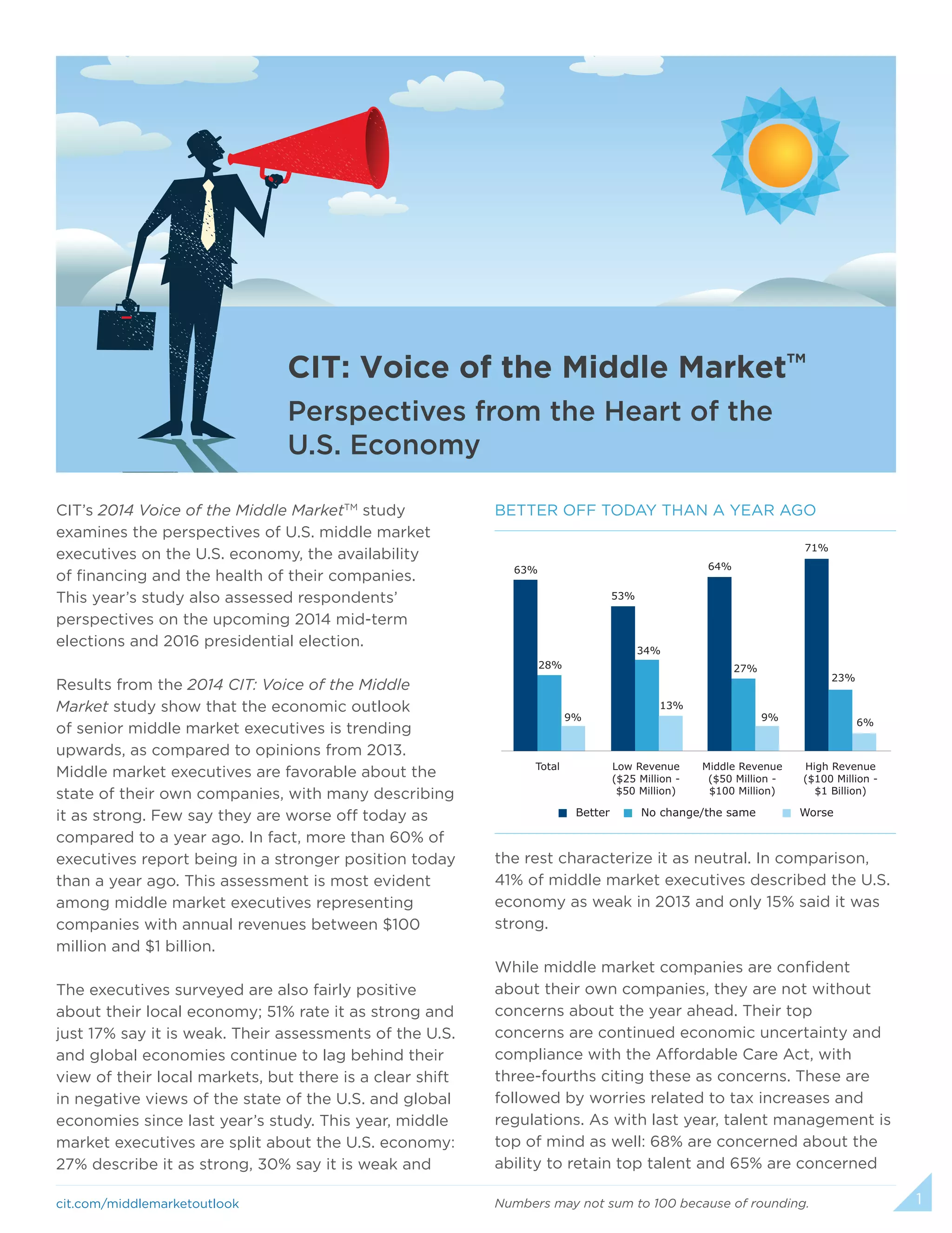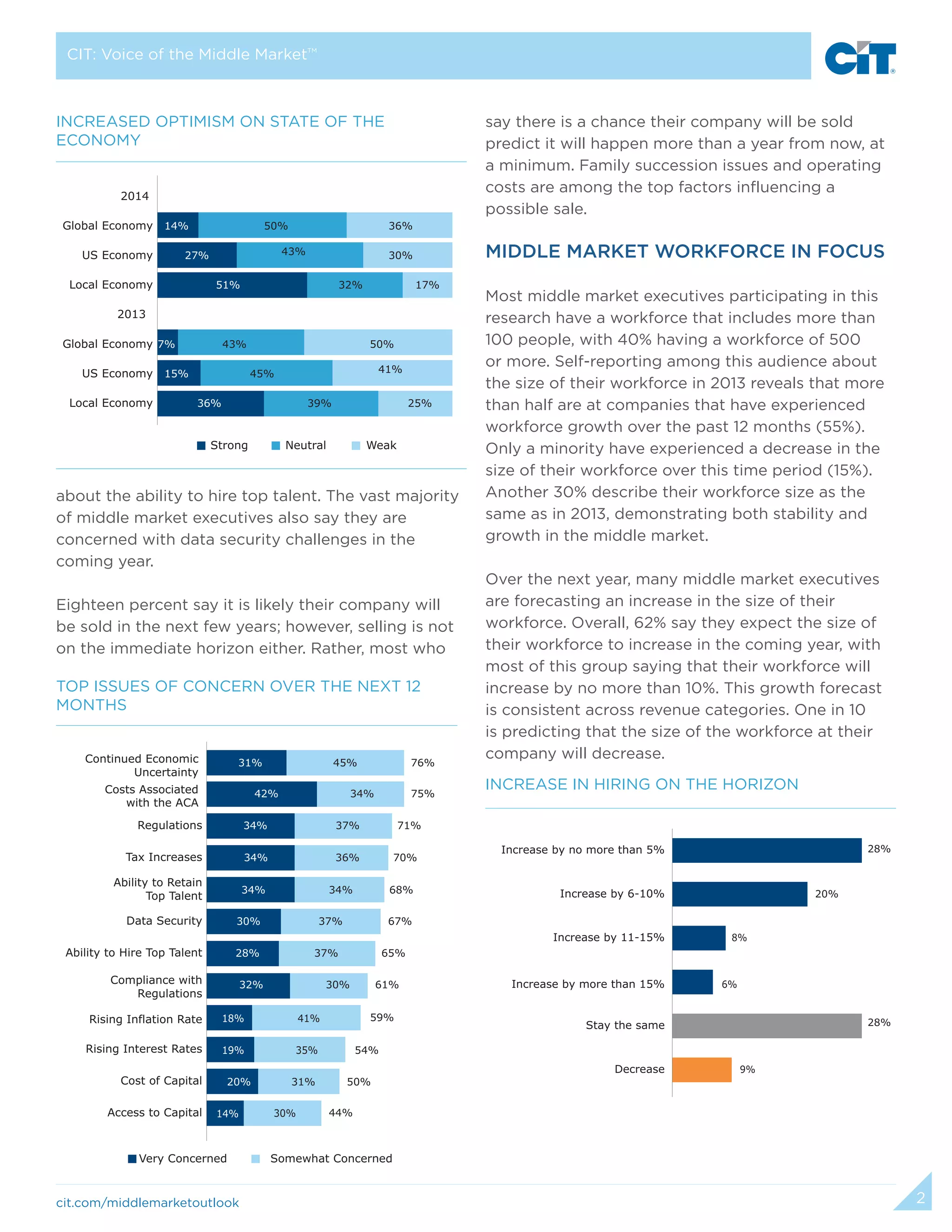 The document summarizes the results of a 2014 study examining the perspectives of 301 U.S. middle market executives on the economy, availability of financing, and health of their companies. Key findings include that the executives have a more positive outlook on the economy than in 2013 and report being in a stronger position than a year ago. Most expect to increase their workforce size over the next year due to business opportunities and demand. The executives are also generally satisfied with their current financing options but want lower interest rates and fees. They have widespread dissatisfaction with Congress and President Obama and want the next Congress to prioritize tax reform and healthcare changes.