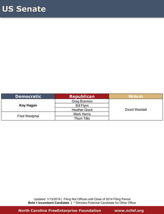 The document provides financial data regarding cash on hand for various North Carolina legislative, judicial, and congressional races as of the third quarter of 2014. It details individual candidates' funding amounts alongside their party affiliations, noting incumbents and their fundraising achievements. The report aims to present a comparative overview of campaign finances across multiple positions in the state.